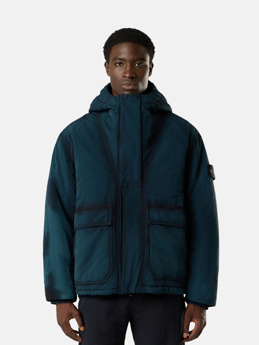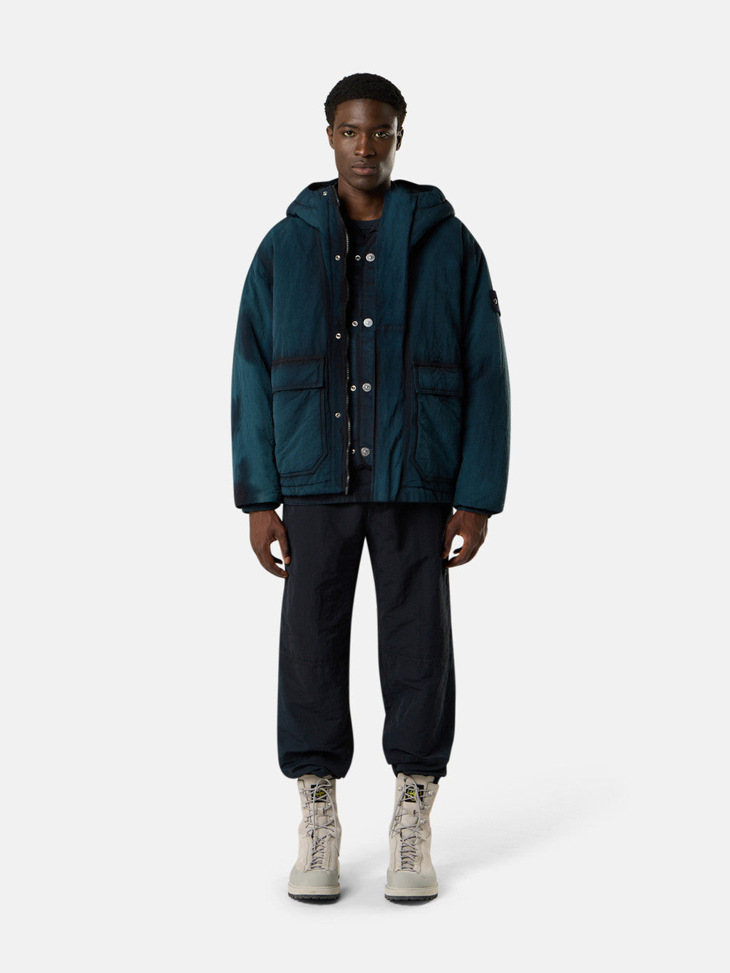 Hooded jacket made from a fabric composed of mechanically spun recycled nylon fibres that are resistant to wear and abrasion. During the spinning process, the nylon filaments are steamed to achieve a feel closer to organic fibres. Garment dyed with carefully selected dyes, then faded through an innovative corrosion treatment, reflecting Stone Island's ongoing commitment to research and experimentation. The corroded areas, particularly where the fabric is thicker, take on varied colours due to the irregularity of the treatment, creating a slightly worn effect and making each piece unique. Quilted padded lining. Treated with a specific anti-drop agent.