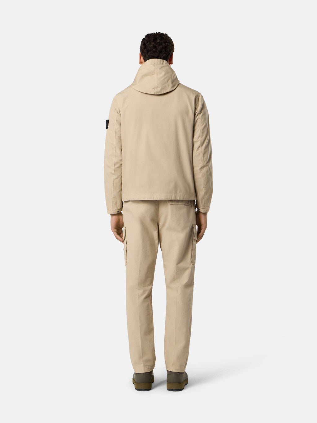 Hooded field jacket in canvas weave cotton. The garment dyeing procedure with specific recipes and the addition of an anti-drop agent lends a unique appearance to the piece.